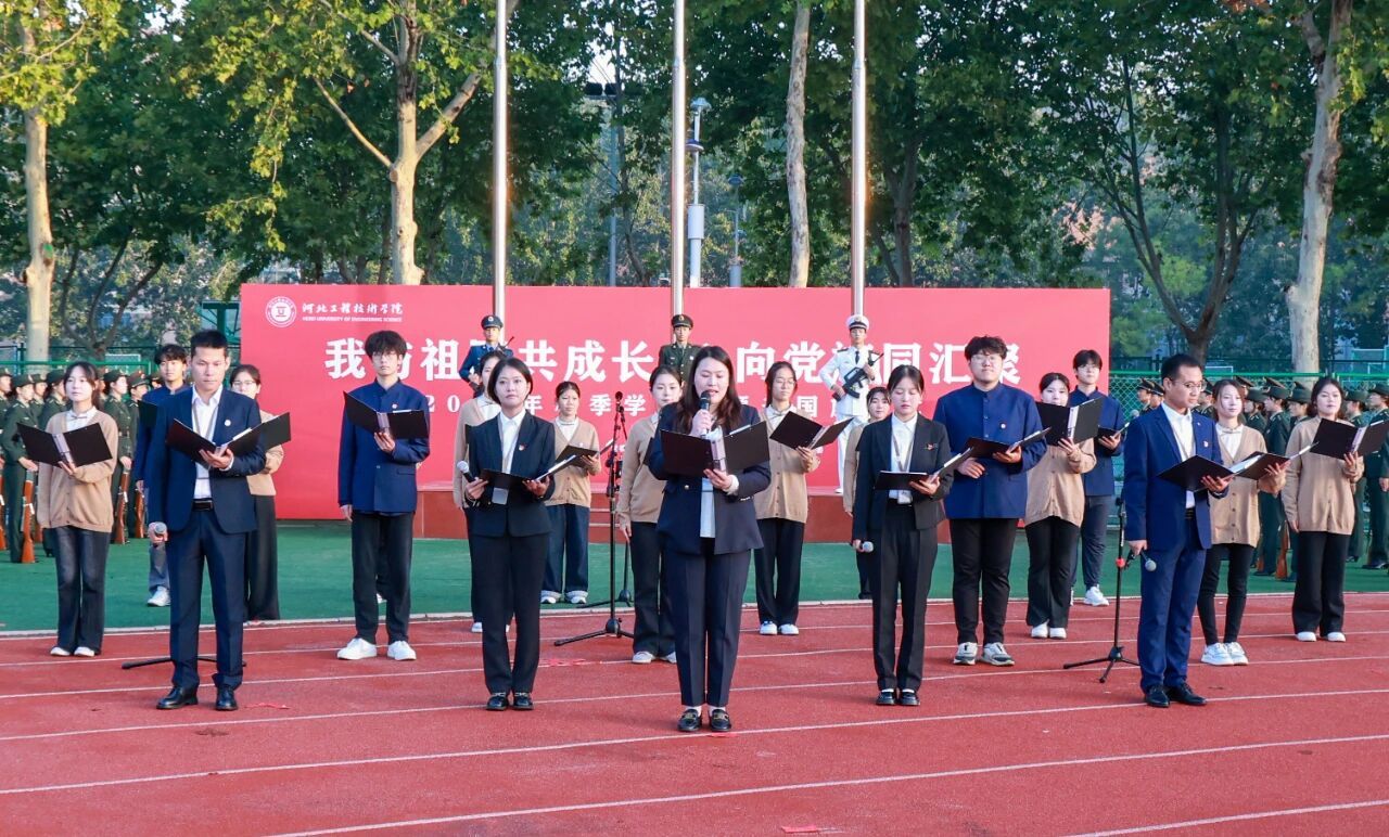 仪式上,党员、团员、青年干部代表共同朗诵《向党旗汇聚与时代同行》。坚定高亢的声音,传递出“党团青”坚定理想信念、勇担历史使命的决心,诠释着红色基因融入血脉的力量,激励着河工青年在新征程中以奋斗之姿激扬青春。