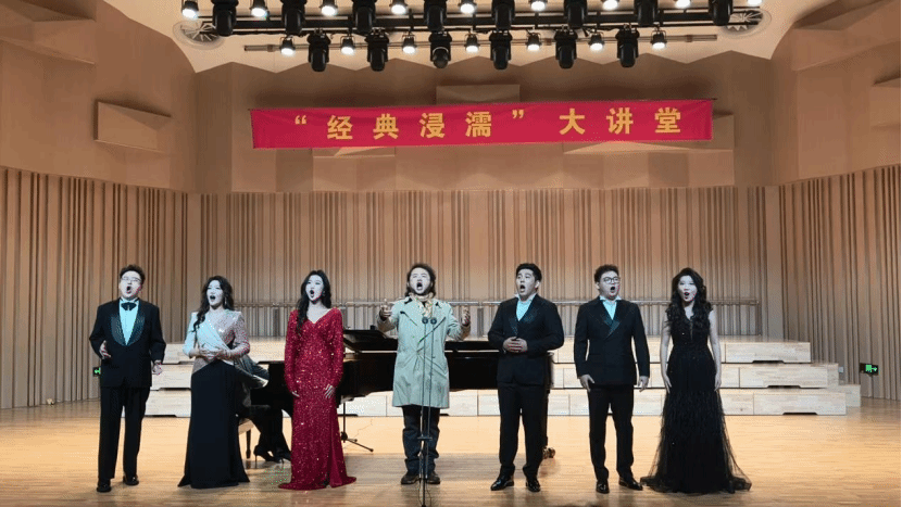 大讲堂尾声,全体演员共同唱响《我和我的祖国》,深情的旋律回荡在整个音乐厅,台上台下情感交融,以歌声传递对祖国的挚爱与祝福,为音乐会画上圆满而有力的句号。