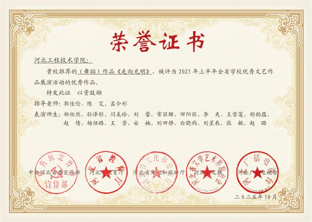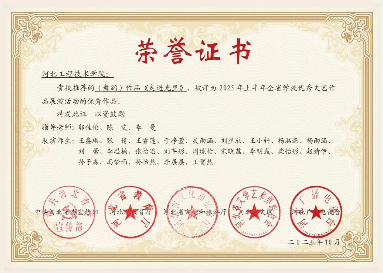 近日,在由省委宣传部、省教育厅、省文化和旅游厅、省文联、河北广播电视台携手共同组织,省直宣传文化相关单位大力支持的2025年上半年全省学校优秀文艺作品展演中,我校艺术与传媒学院、美育教学部精心打造的原创舞蹈作品《走向光明》《走进光里》《蜜》荣获“优秀作品奖”。