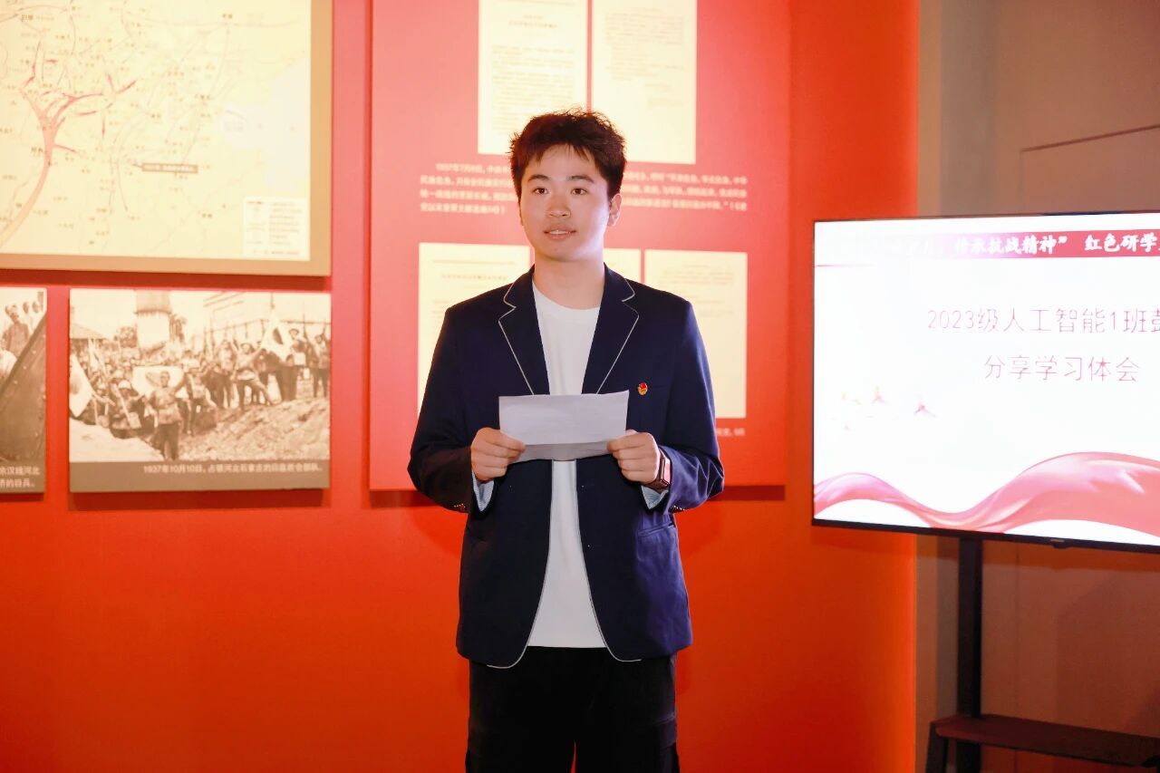 2023级人工智能1班彭爽同学分享研学感悟。他表示,此次研学是一次深刻的精神洗礼与思想升华,革命先烈用青春和生命铸就的精神丰碑令人动容,作为新时代大学生,应把红色基因融入血脉,以实际行动践行“请党放心,强国有我”的青春誓言。