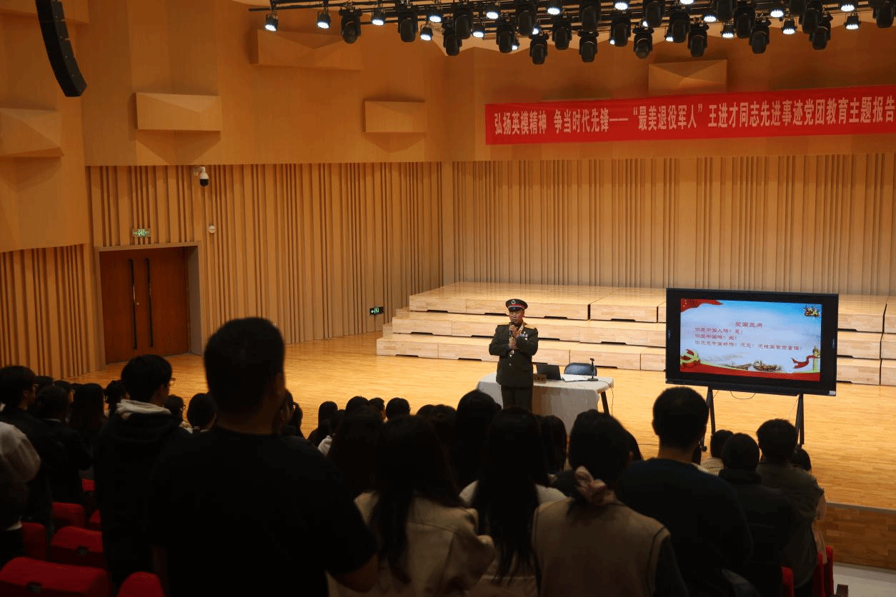 11月14日,以“弘扬英模精神,争当时代先锋”为主题的“最美退役军人”王进才同志先进事迹党团教育主题报告会在校音乐厅举行。报告会旨在通过身边榜样的感人事迹,引导广大师生坚定理想信念,锤炼高尚品格,激发奋斗热情。我校艺术与传媒学院负责同志、全院教职工、学生党员、入党积极分子参与了本次活动。