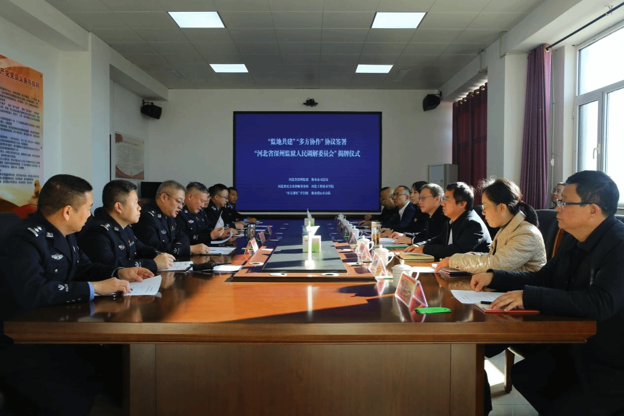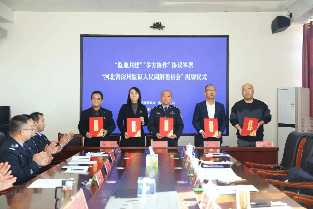 会上,深州监狱领导分别与各合作单位组织负责人签署《人民调解多方合作协议》,并共同为河北省深州监狱人民调解委员会揭牌,标志着“司法行政指导、监狱主导、法律支撑、学术赋能、媒体助力、社会关爱”的多元共治格局正式形成。