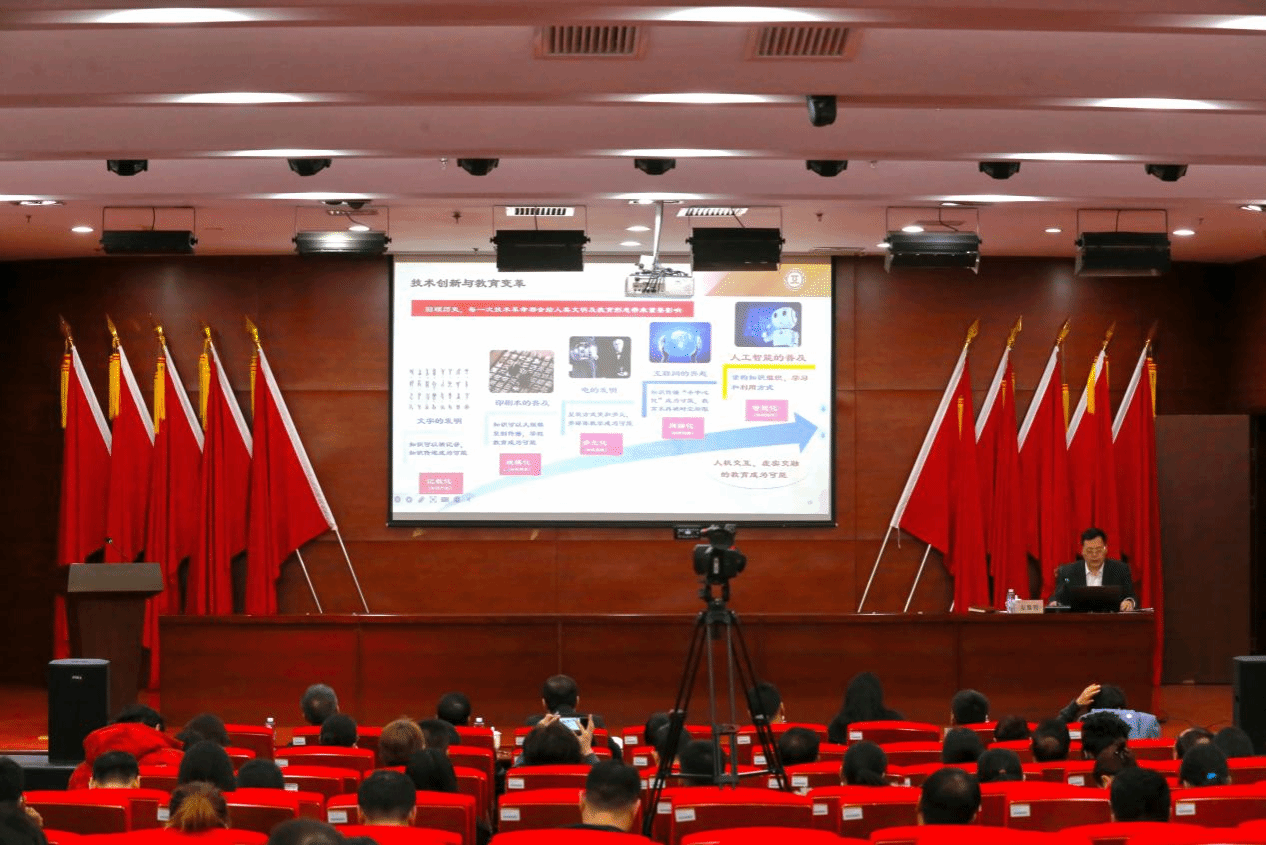 在“人工智能赋能教育变革”部分,安校长结合国家教育数字化战略布局,深入阐释了人工智能技术对教育理念、教学模式与治理体系带来的革命性影响。他提出,要沿着“集成化、智能化、国际化”发展路径,构建“师-生-机”三元协同的教育新生态。安校长强调,全校教师要积极投身“人工智能+高等教育”实践,做到“学AI、用AI、创AI、护AI”:掌握智能技术,夯实育人新基本功;推动AI与教学、科研、管理深度融合;开展跨学科合作,研发学科大模型与智能工具;筑牢数据、算法与伦理安全底线,推动人工智能合规向善发展。