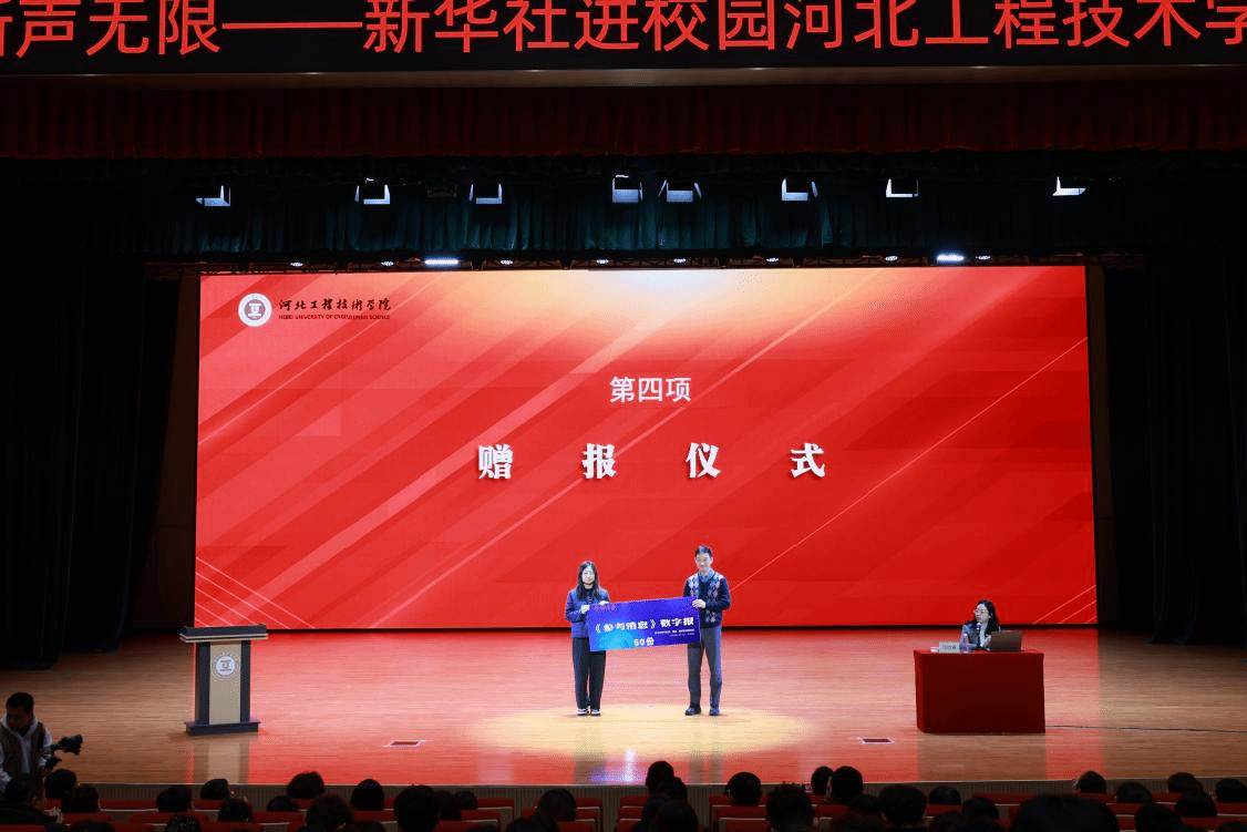 在热烈掌声中,参考消息报社向我校赠送《参考消息》手机数字报,鼓励师生拓宽国际视野,涵养家国情怀。