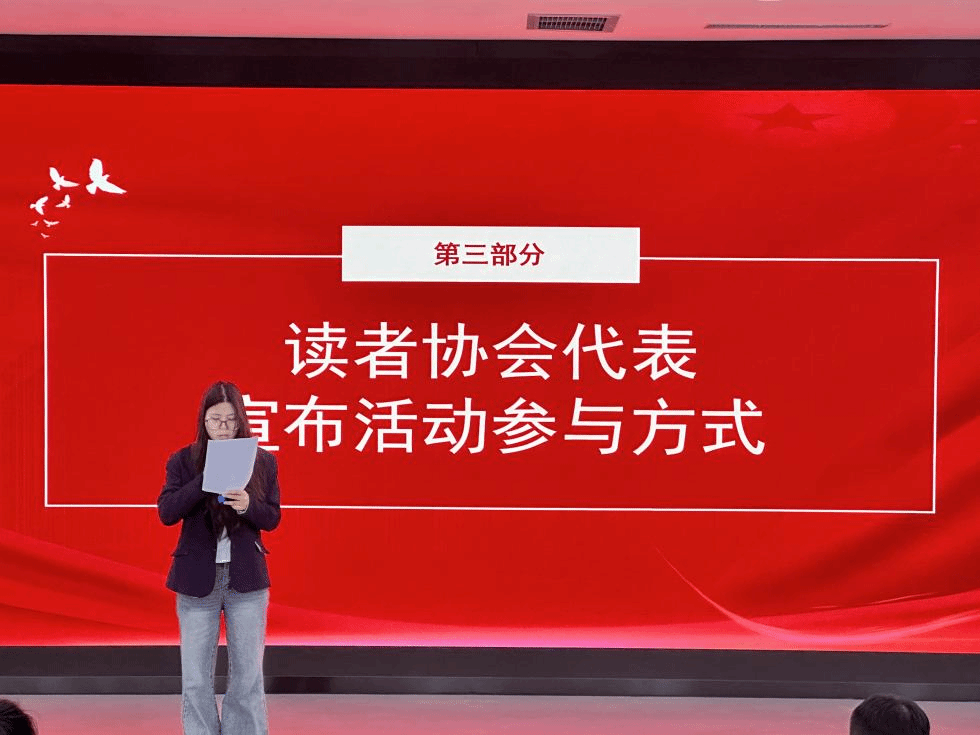 活动现场播放了“阅读与青春”主题短片,生动呈现了阅读与青春奋斗相伴成长的画面,引发了在场师生的共鸣。读者协会代表介绍了活动的参与方式,号召全体同学积极加入阅读行动,通过线上线下多种形式共享阅读乐趣、交流阅读心得。
