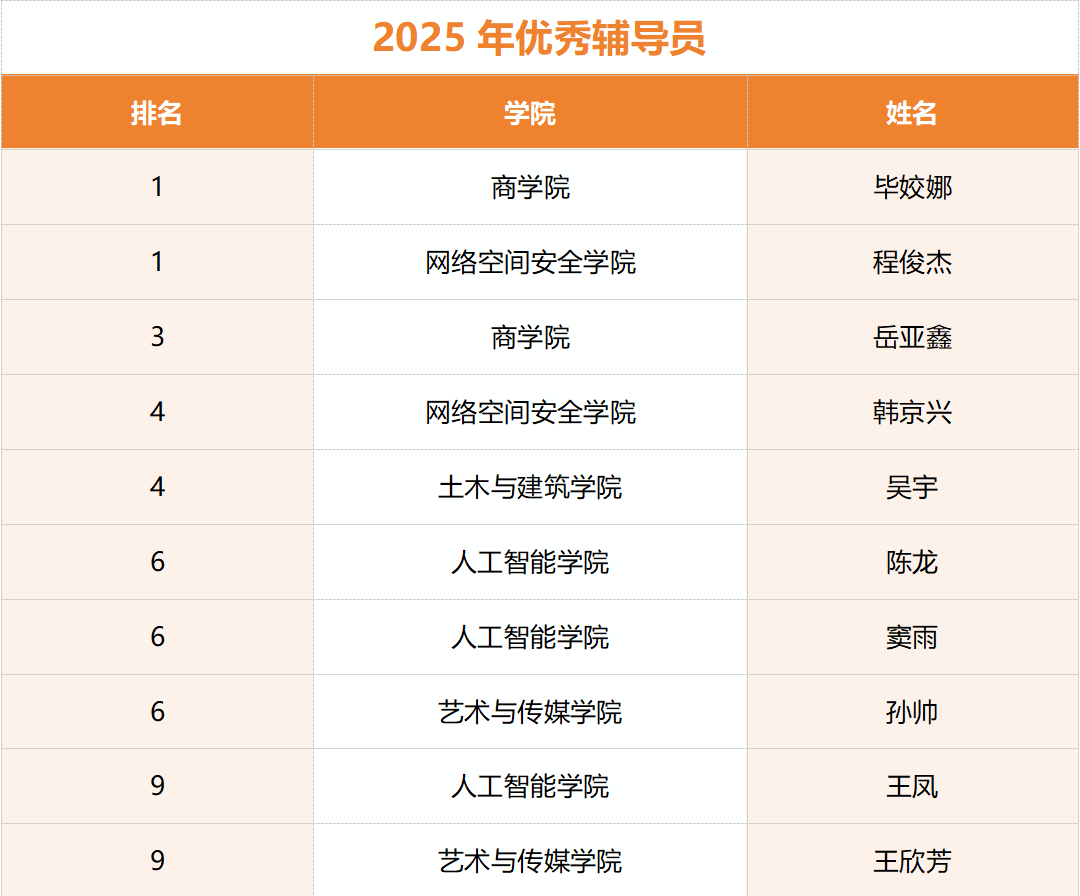本次评选面向从事辅导员工作满两年及以上的专职辅导员,重点考察其在2025年度的工作业绩。经个人申请、学院推荐与校级评审,共有10名优秀辅导员脱颖而出,获评本年度优秀辅导员。