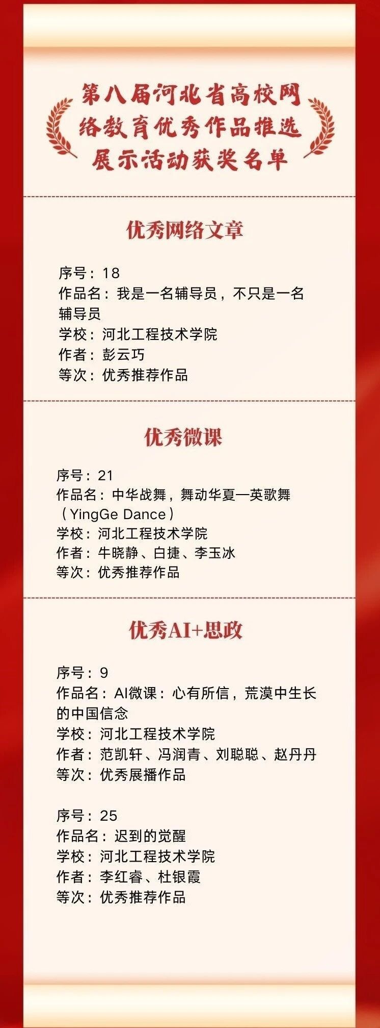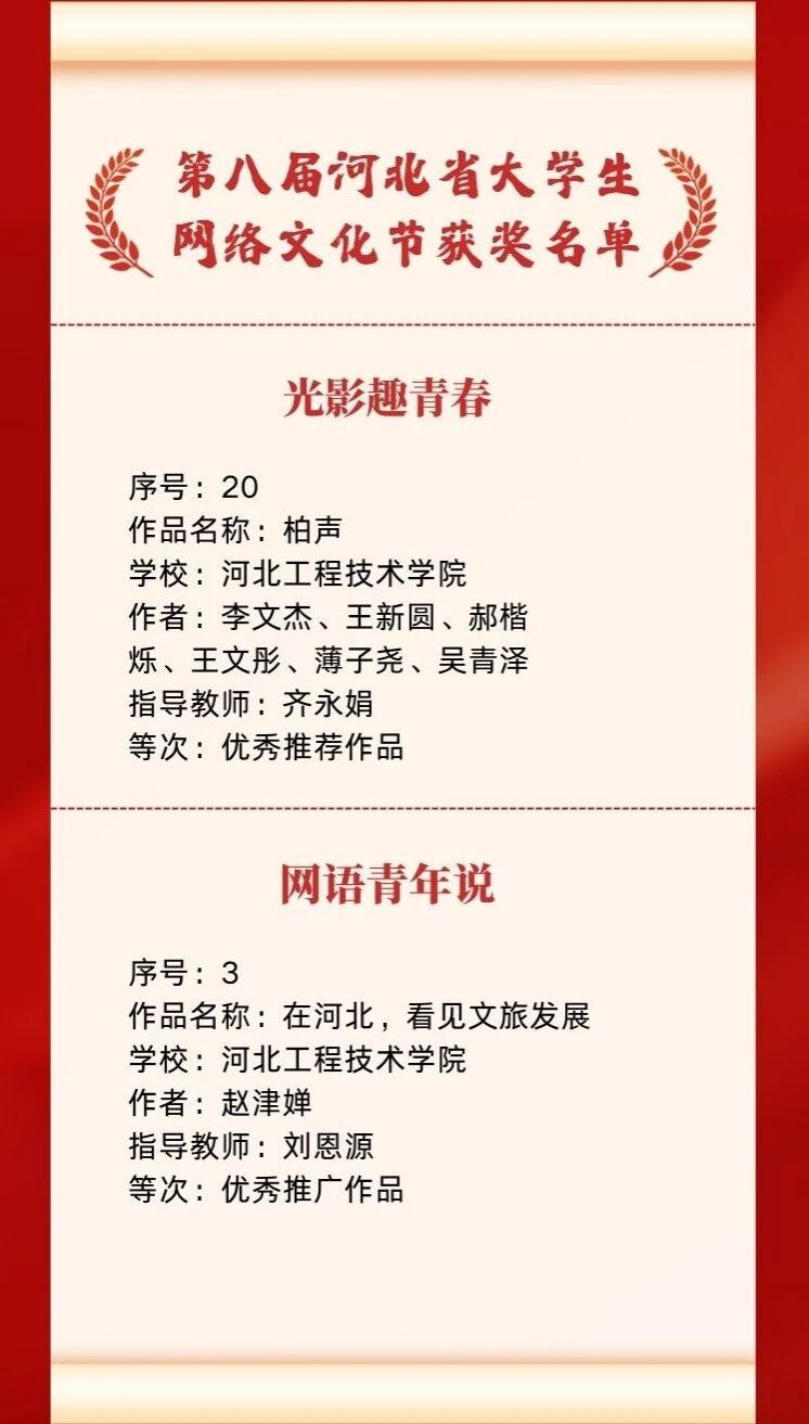 在河北省大学生网络文化节活动中,我校学生作品《在河北,看见文旅发展》在网语青年说赛道获“优秀推广作品”奖,《柏声》在光影趣青春赛道获“优秀推荐作品”奖。在河北省高校网络教育优秀作品推选展示活动中,我校教师作品《我是一名辅导员,不只是一名辅导员》荣获优秀网络文章赛道“优秀推荐作品”奖,《中华战舞,舞动华夏-英歌舞(YingGe Dance)》获优秀微课赛道“优秀推荐作品”奖,《AI微课:心有所信,荒漠中生长的中国信念》《迟到的觉醒》在优秀AI+思政赛道分别获“优秀展播作品”和“优秀推荐作品”奖。