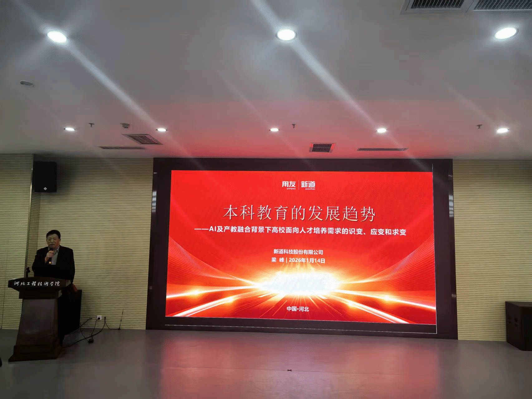 揭牌仪式后,新道科技股份有限公司首席专家梁峰作题为《本科教育的发展趋势——AI及产教融合背景下高校面向人才培养需求的识变、应变、求变》的主旨报告。报告深入剖析了当前本科教育面临的机遇与挑战,系统阐述了高校人才培养“识变、应变、求变”的路径与方法。