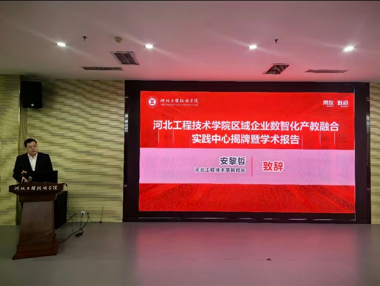 安黎哲校长发表致辞。他表示,河北工程技术学院作为一所服务地方的应用型大学,始终将人才培养与区域发展需求紧密结合。此次区域企业数智化产教融合实践中心的成立,是学校应对数智化时代挑战、深化教育教学改革的重要举措,将为学校高素质应用型人才培养注入新的动力,为服务区域产业升级搭建平台。