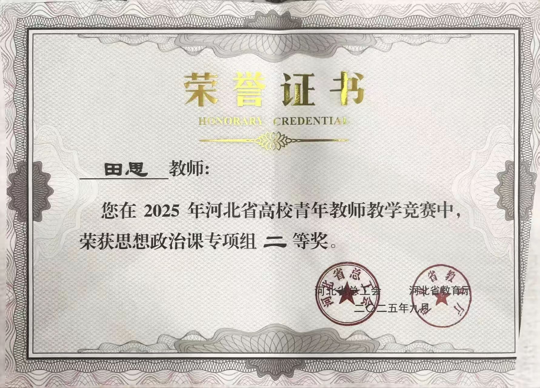 田老师始终将教学竞赛视为检验教学水平、提升专业素养的重要平台。她以赛促教、以赛促研,凭借过硬的教学功底与执着的奋斗精神,在教学竞赛中一路披荆斩棘,先后斩获马克思主义学院第四届青年教师思想政治理论课二等奖、河北工程技术学院第三届青年教师教学竞赛二等奖、2025年河北省高校青年教师教学竞赛思想政治课专项组二等奖。