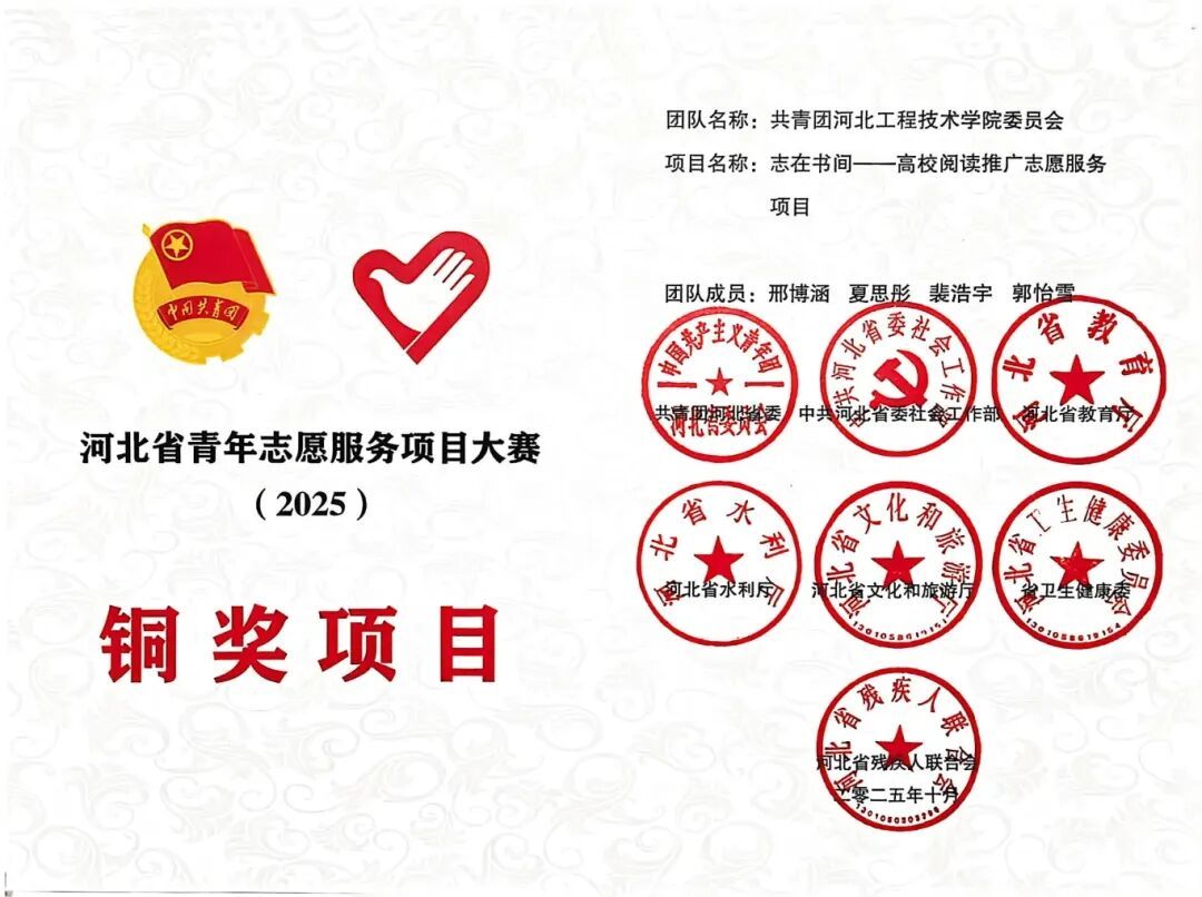 近日,2025年河北省青年志愿服务项目大赛评选结果揭晓。由我校团委申报的 “志在书间——高校阅读推广志愿服务项目” 在全省众多优秀项目中脱颖而出,荣获铜奖,展现了我校青年志愿服务工作的扎实成效与创新活力。