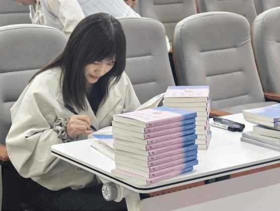 在互动交流环节,现场学生踊跃提问,围绕写作灵感、表达勇气与时间管理等话题与韦娜老师展开交流。韦娜结合自身创作经历逐一细致解答,并向提问学生赠送了亲笔签名的代表作《慢慢长出新的自己》,以文字为礼,助力学子逐光成长。