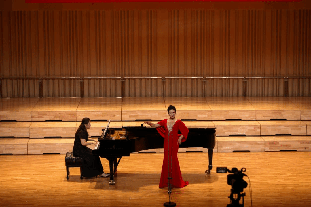 音乐会以寒晖合唱团演唱的《太行山上》开场,歌声尽显“山高林密,兵强马壮”的豪情;《游击队之歌》传递出革命乐观主义精神;《沁园春·雪》以雄浑笔触描绘山河、抒发抱负。声乐歌剧系教师李晨在胡睿老师钢琴伴奏下,悲怆演绎《松花江上》;张文博演唱的《黄河怨》,如泣如诉地展现了受难妇女的血泪控诉;魏佳演唱的《把一切献给党》,唱出矢志不渝的信仰;温婧媛的《红太阳照边疆》以欢快深情的旋律赞美新祖国;姜莎演唱的《天下乡亲》,讴歌“江山就是人民,人民就是江山”的情怀。